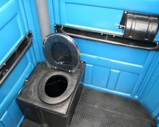 Caixa de dejetos com assento, porta papel higiênico, piso antiderrapante em polietileno, identificação (masculino/feminino), descarga na caixa de dejeto com acionamento manual, ponto de ventilação natural, mictório, teto translúcido, fechadura de metal com sinalizador (livre/ocupado).
